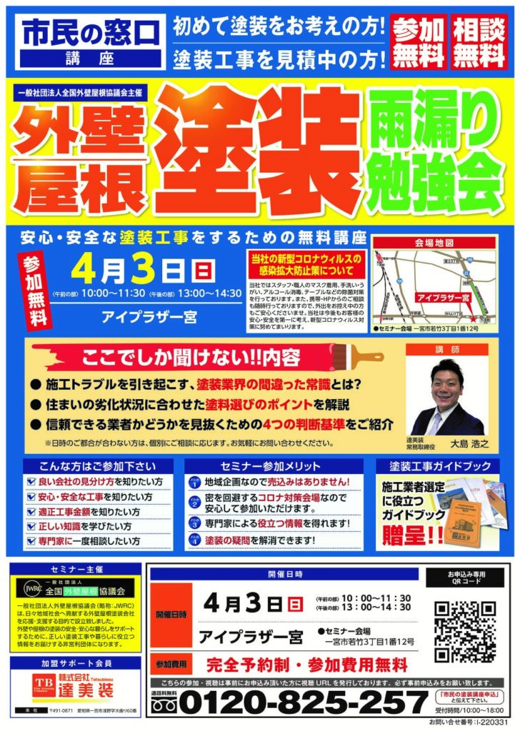 【無料】4月3日(日)外壁・屋根塗装 雨漏り勉強会を開催します!