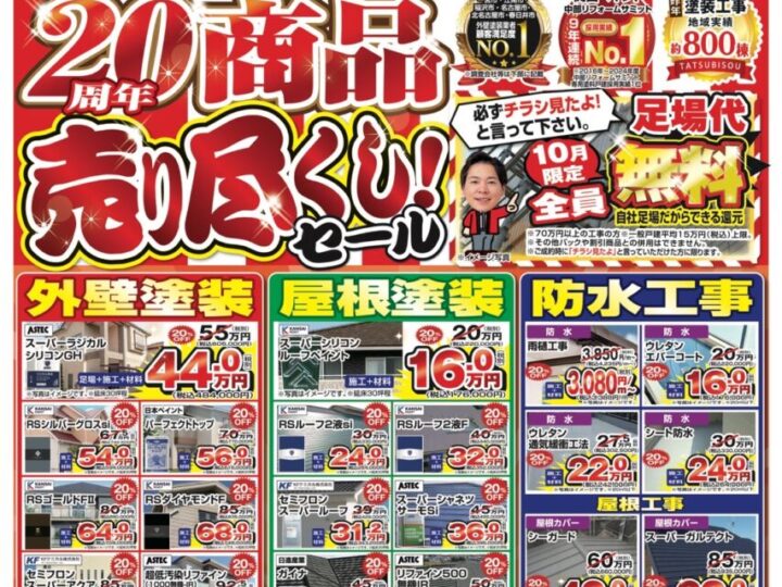 地域の皆様こんにちは 外壁塗装・屋根塗装専門店達美装です! 日頃から大変多くのご依頼をいただくと同時に、格別なご贔屓をいただいております地域の皆様のおかげでございます! 誠にありがとうございます。 9/6(土)名古屋地区、9/13(土)尾張地区の新聞紙面に広告が掲載されます。 ぜひご覧ください!! 達美装 20周年創業祭!! 9月中にお問い合わせいただいた方に…足場の原価が高騰していますが、今回特別に!足場代金 全員無料!!※各種条件有り ★外壁塗装&屋根塗装&防水工事の大変お値打ちなプランをご用意いたしました✨ WEBで事前予約&見積り依頼の方は、さらに特典あり!※お一人様一回まで 予約はこちら⇒https://www.tatsubisou.com/contact/ ————————————————————————————————————————————————- 外壁塗装・屋根塗装について詳しく知りたい方は是非ショールームに来店して頂きご質問してください! 愛知県一宮市・江南市の外壁塗装・屋根塗装・防水工事のご相談・お見積り依頼・診断(無料)は株式会社達美装 外壁塗装ショールーム来店予約はこちら↓ 来店予約 愛知県一宮市の外壁塗装&防水専門店株式会社達美装 本社/塗装・防水資材置き場〒491-0871 愛知県一宮市浅野字大曲り60TEL:0586-85-6172 FAX:0586-85-6173 仮設資材センター〒491-0813 愛知県一宮市千秋町町屋字端畑60 一宮ショールーム〒491-0831 愛知県一宮市森本4丁目13-23TEL:0120-825-257 江南ショールーム〒483-8272 愛知県江南市古知野北屋敷89 TEL:0120-825-257 稲沢ショールーム〒492-8213 稲沢市高御堂2丁目14番地5 TEL:0120-825-257 名古屋ショールーム〒462-0026 名古屋市北区萩野通2丁目14 TEL:0120-825-257 春日井ショールーム〒486-0846 春日井市朝宮町2丁目14-8 TEL:0120-825-257 アパート・マンション大規模修繕専門店TB-STYLEショールーム〒491-0064 愛知県一宮市宮西通8丁目25-1 TEL:0120-931-797 (2025.09.05 更新) 詳しく見る スタッフブログ新着情報イベント・キャンペーン