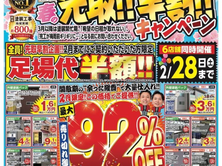 地域の皆様こんにちは(^^ 外壁塗装・屋根塗装専門店達美装です! 日頃から大変多くのご依頼をいただくと同時に、格別なご贔屓をいただいております地域の皆様のおかげでございます! 誠にありがとうございます。 外壁塗装&屋根塗装「初売り祭」のご案内です! 【✨初売6大特典✨】 特典❶お見積り特典お見積りご依頼のお客様に…①サイコロの出た目の数だけカップラーメンプレゼント🎁 特典❷ご成約特典ご成約いただいたお客様に…【松】200万円以上:パナソニックヘアドライヤープレゼント🎁【竹】150万円以上:ハイパワー布団乾燥機プレゼント🎁【梅】50万円以上:カタログギフト10,000円分プレゼント🎁 特典❸大運だめしお見積りご依頼のお客様に…大吉 ギフトカード10,000円分 3名様中吉 松坂牛選べるギフト5,000円分 5名様小吉 マックカード1,000円分 10名様赤吉 BOXティッシュ はずれなし 特典❹足場代無料!(20万円相当)チラシをお持ちの方必ず「チラシ見たよ」とお伝えください♪※1月ご成約の方限定※70万円以上の工事の方 特典❺塗装給付金1月ご成約の方限定!!関西ペイントのプランご契約の方全員15万円(税込み)OFF❗️必ず「チラシ見たよ」とお伝えください♪※70万円以上の工事の方 特典❻初売りお年玉パック安さの限界突破⚡️大変お値打ちな塗装パックをご用意!それぞれ抽選で1名様に当たります! その他、大特価商品を多数ご用意しております!!外壁塗装&屋根リフォームのご質問&ご相談は無料です! 予約はこちらからもできます!⇒https://www.tatsubisou.com/contact/ ‐‐‐‐‐‐‐‐‐‐‐‐‐‐‐‐‐‐‐‐‐‐‐‐‐‐‐‐‐‐‐‐‐‐‐‐‐‐‐‐‐‐‐‐‐‐———————————————————————————- 外壁塗装・屋根塗装について詳しく知りたい方は是非ショールームに来店して頂きご質問してください! 愛知県一宮市・江南市の外壁塗装・屋根塗装・防水工事のご相談・お見積り依頼・診断(無料)は株式会社達美装 外壁塗装ショールーム来店予約はこちら↓ 来店予約 愛知県一宮市の外壁塗装&防水専門店株式会社達美装 本社/塗装・防水資材置き場〒491-0871 愛知県一宮市浅野字大曲り60TEL:0586-85-6172 FAX:0586-85-6173 仮設資材センター〒491-0813 愛知県一宮市千秋町町屋字端畑60 一宮ショールーム〒491-0831 愛知県一宮市森本4丁目13-23TEL:0120-825-257 江南ショールーム〒483-8272 愛知県江南市古知野北屋敷89TEL:0120-825-257 稲沢ショールーム〒492-8213 稲沢市高御堂2丁目14番地5TEL:0120-825-257 名古屋ショールーム〒462-0026 名古屋市北区萩野通2丁目14TEL:0120-825-257 春日井ショールーム〒486-0846 春日井市朝宮町2丁目14-8TEL:0120-825-257 アパート・マンション大規模修繕専門店TB-STYLEショールーム〒491-0064 愛知県一宮市宮西通8丁目25-1TEL:0120-931-797 (2026.01.16 更新) 詳しく見る スタッフブログ新着情報イベント・キャンペーン