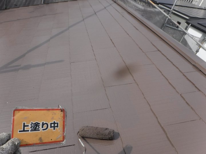 【上塗り】塗料を3回塗り重ねることで外壁の艶が増し、紫外線や雨水に強い耐久性のある外壁に仕上がります。