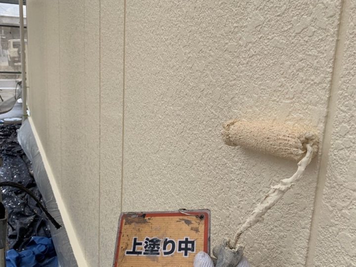 【上塗り】塗料を3回塗り重ねることで外壁の艶が増し、紫外線や雨水に強い耐久性のある外壁に仕上がります。