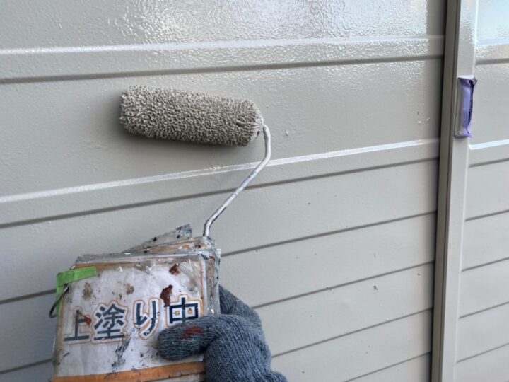 【上塗り】塗料を3回塗り重ねることで外壁の艶が増し、紫外線や雨水に強い耐久性のある外壁に仕上がります。