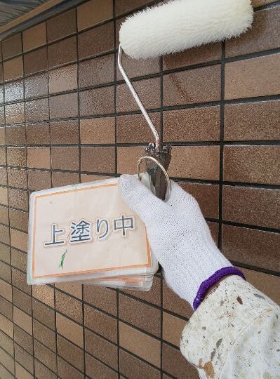 【上塗り】塗料を塗り重ね、表面を保護し艶のある外壁に仕上げます。