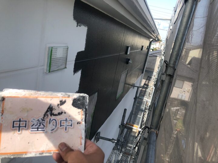 【上塗り】塗料を3回塗り重ねることで外壁の艶が増し、紫外線や雨水に強い耐久性のある外壁に仕上がります。