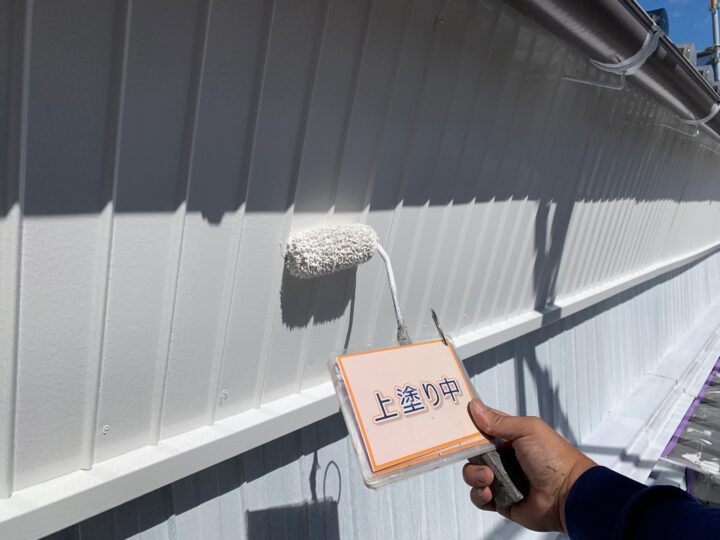 【上塗り】塗料を3回塗り重ねることで外壁の艶が増し、紫外線や雨水に強い耐久性のある外壁に仕上がります。