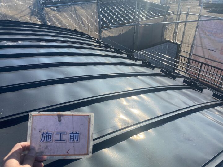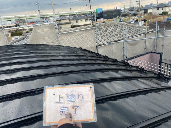 【上塗り】塗料を3回塗り重ねることで艶が増し、紫外線や雨水に強い耐久性のある屋根に仕上がります。