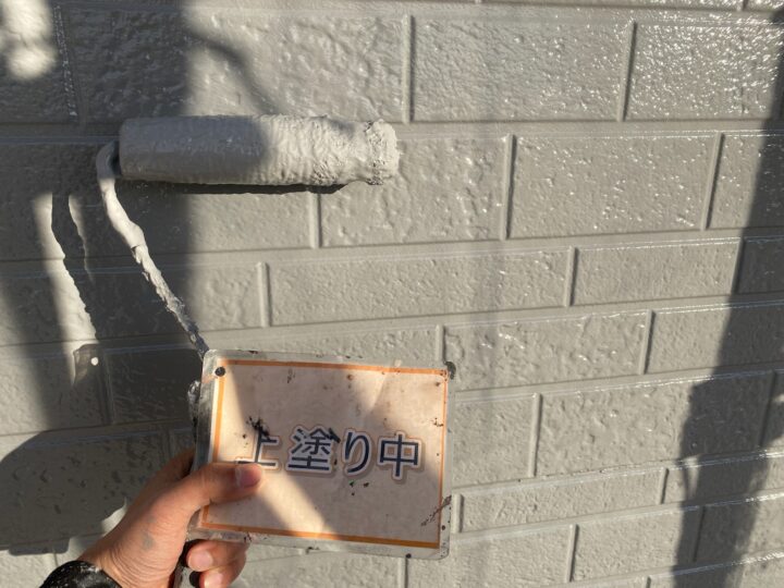 【上塗り】塗料を3回塗り重ねることで外壁の艶が増し、紫外線や雨水に強い耐久性のある外壁に仕上がります。