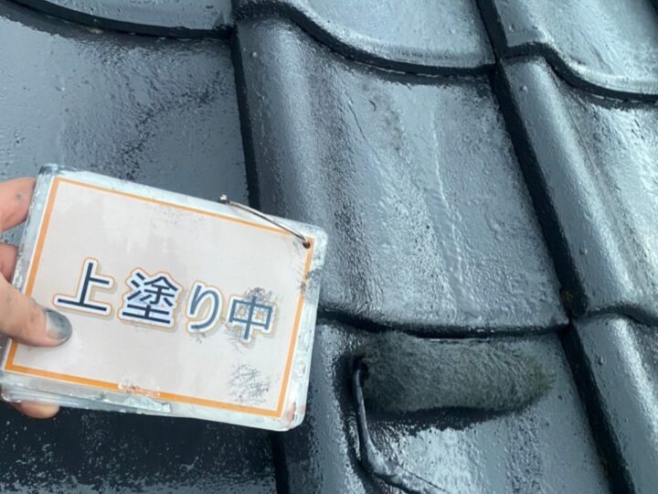【上塗り】塗料を3回塗り重ねることで艶が増し、紫外線や雨水に強い耐久性のある屋根に仕上がります。