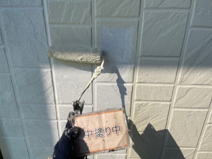 【上塗り】塗料を3回塗り重ねることで外壁の艶が増し、紫外線や雨水に強い耐久性のある外壁に仕上がります。