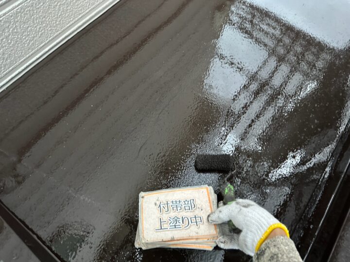 【上塗り】塗料を3回塗り重ねることで艶が増し、紫外線や雨水に強い耐久性のある屋根に仕上がります。