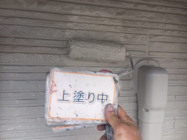 【上塗り】塗料を3回塗り重ねることで外壁の艶が増し、紫外線や雨水に強い耐久性のある外壁に仕上がります。