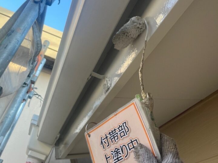 【上塗り】塗料を3回塗り重ねることで外壁の艶が増し、紫外線や雨水に強い耐久性のある外壁に仕上がります。