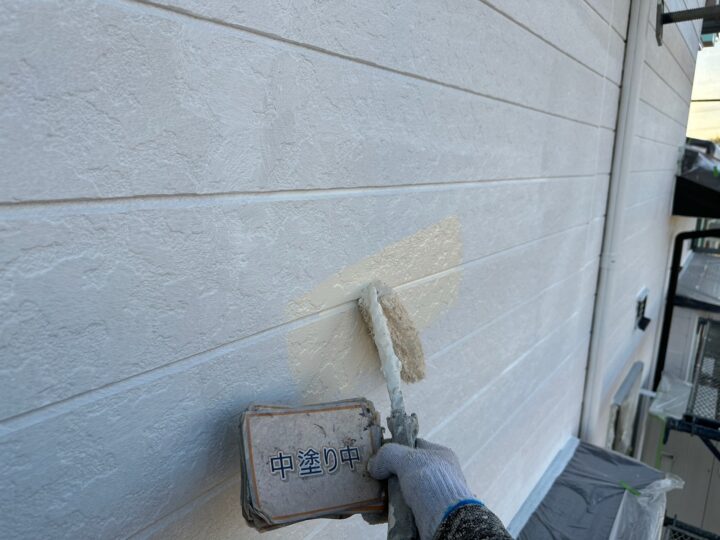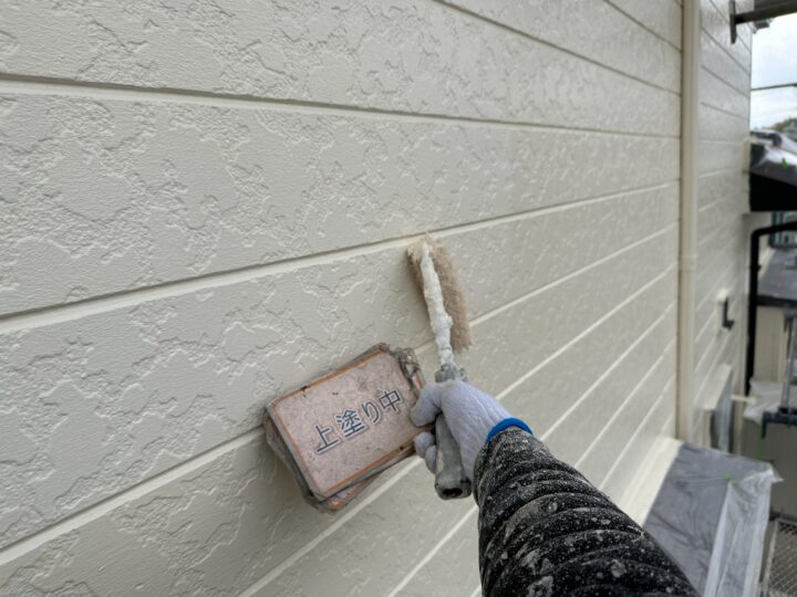 【上塗り】塗料を3回塗り重ねることで外壁の艶が増し、紫外線や雨水に強い耐久性のある外壁に仕上がります。