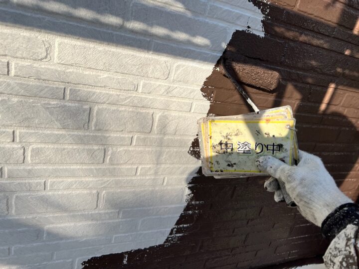 【上塗り】塗料を3回塗り重ねることで外壁の艶が増し、紫外線や雨水に強い耐久性のある外壁に仕上がります。