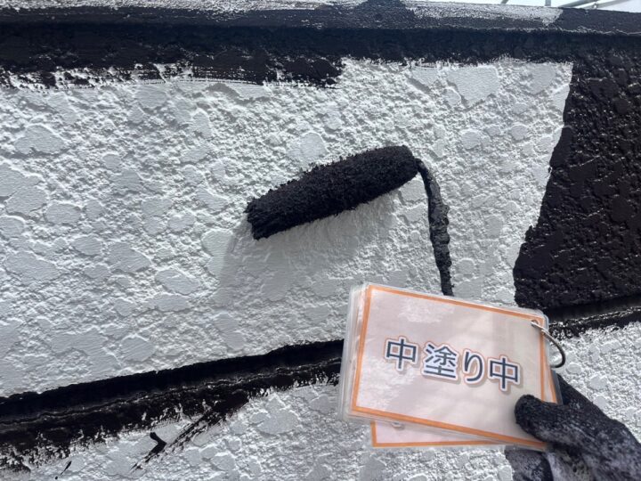 【上塗り】塗料を3回塗り重ねることで外壁の艶が増し、紫外線や雨水に強い耐久性のある外壁に仕上がります。