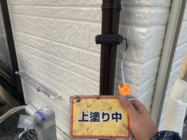 【上塗り】塗料を3回塗り重ねることで外壁の艶が増し、紫外線や雨水に強い耐久性のある外壁に仕上がります。