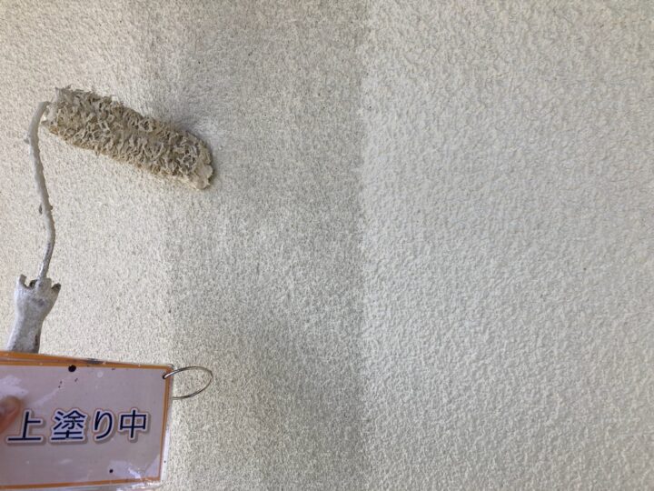 【上塗り】塗料を3回塗り重ねることで外壁の艶が増し、紫外線や雨水に強い耐久性のある外壁に仕上がります。