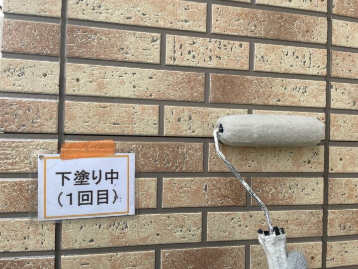 【クリヤー塗装1回目】外壁のデザインをそのまま生かすため、クリヤー塗料を塗布します。