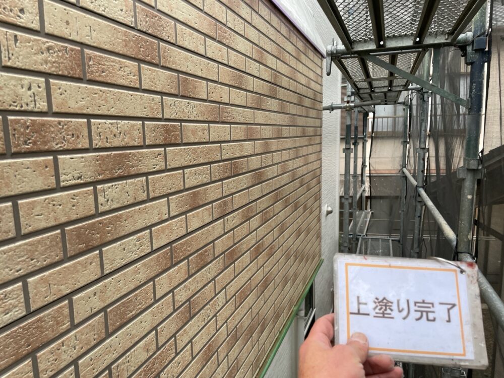 【上塗り】塗料を3回塗り重ねることで外壁の艶が増し、紫外線や雨水に強い耐久性のある外壁に仕上がります。