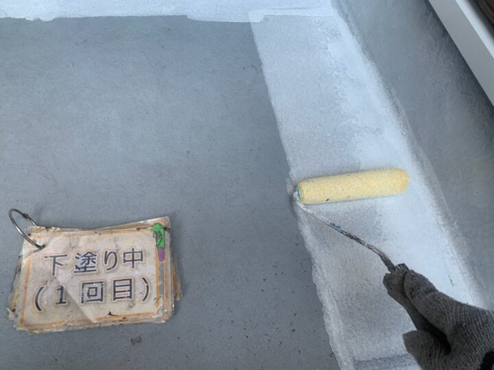 【プライマー塗布】隅の部分から雨漏りしやすいため、隅々まで丁寧に塗布していきます。