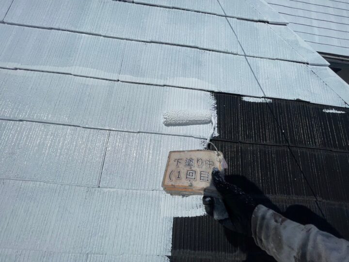 【上塗り】塗料を3回塗り重ねることで艶が増し、紫外線や雨水に強い耐久性のある屋根に仕上がります。