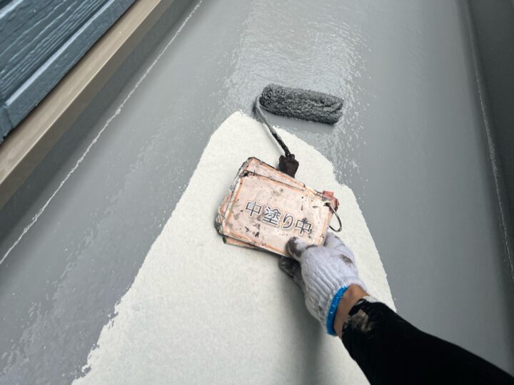 【上塗り】塗料を3回塗り重ねることで艶が増し、紫外線や雨水に強い耐久性のある屋根に仕上がります。