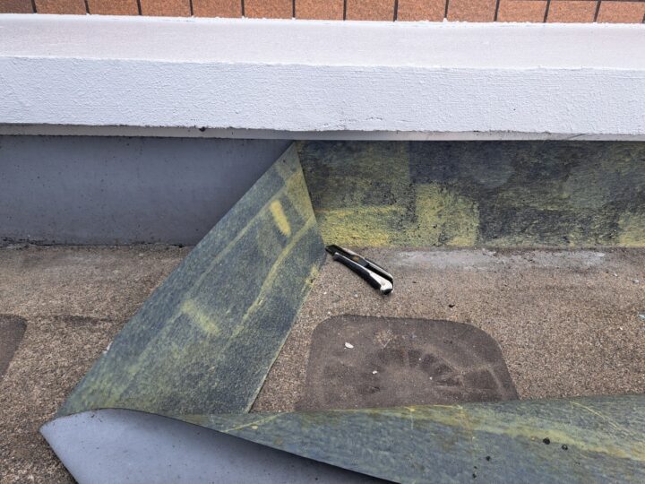 【立ち上がり部分シート撤去】既存防水を撤去し、丁寧に清掃を行います。
