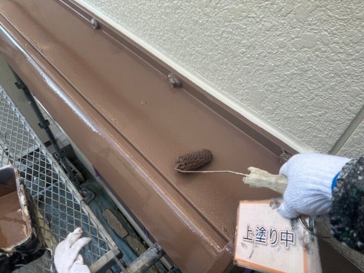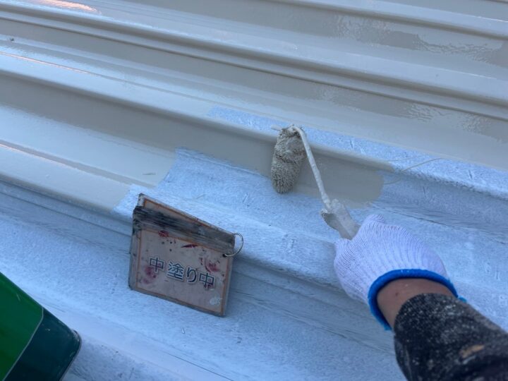 【上塗り】塗料を3回塗り重ねることで艶が増し、紫外線や雨水に強い耐久性のある屋根に仕上がります。
