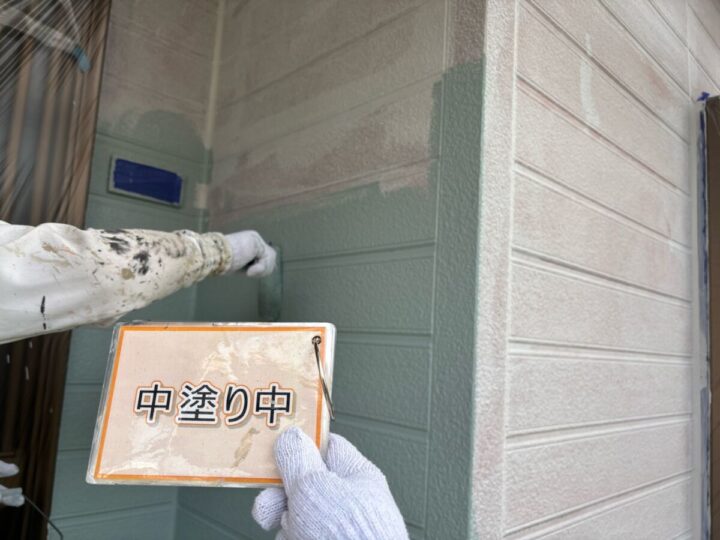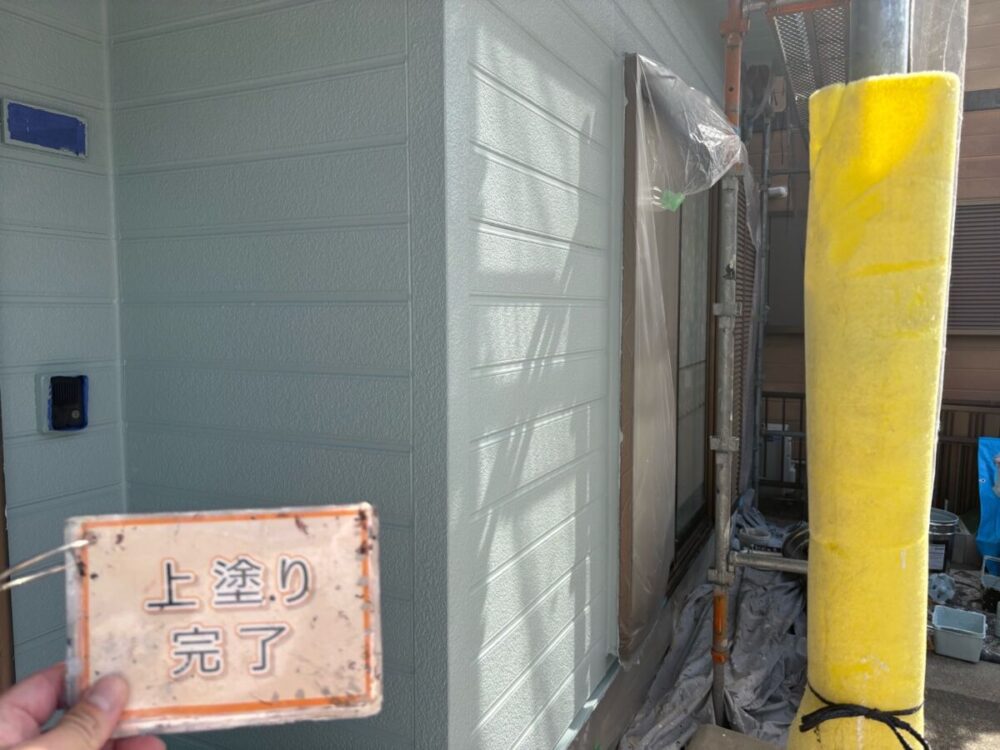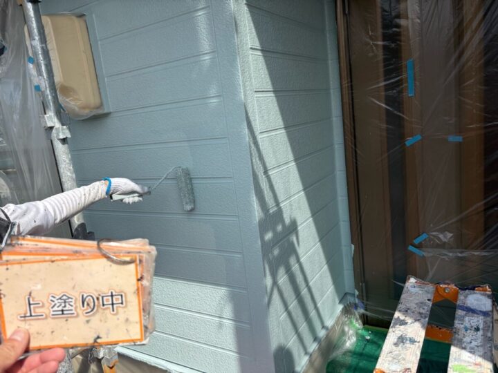 【上塗り】塗料を3回塗り重ねることで外壁の艶が増し、紫外線や雨水に強い耐久性のある外壁に仕上がります。
