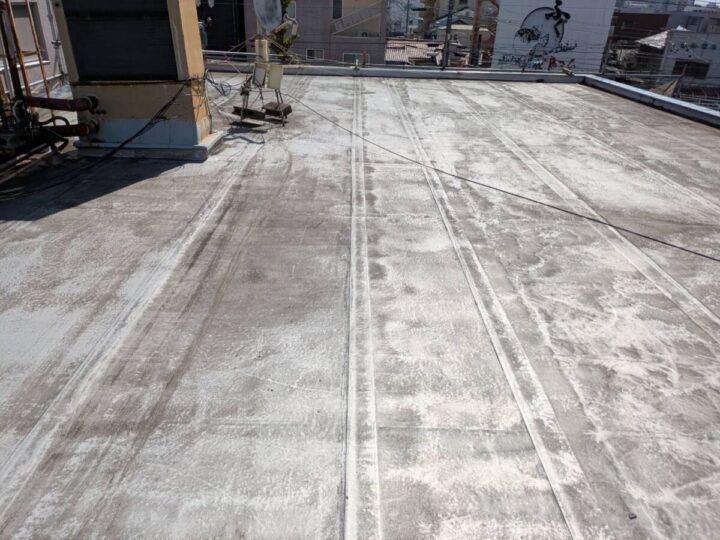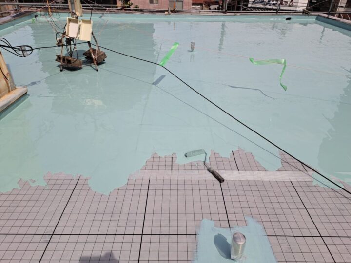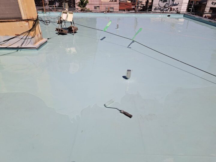 【ウレタン塗膜流し込み1回目】ウレタン防水材を塗布します。屋上防水工事⑤