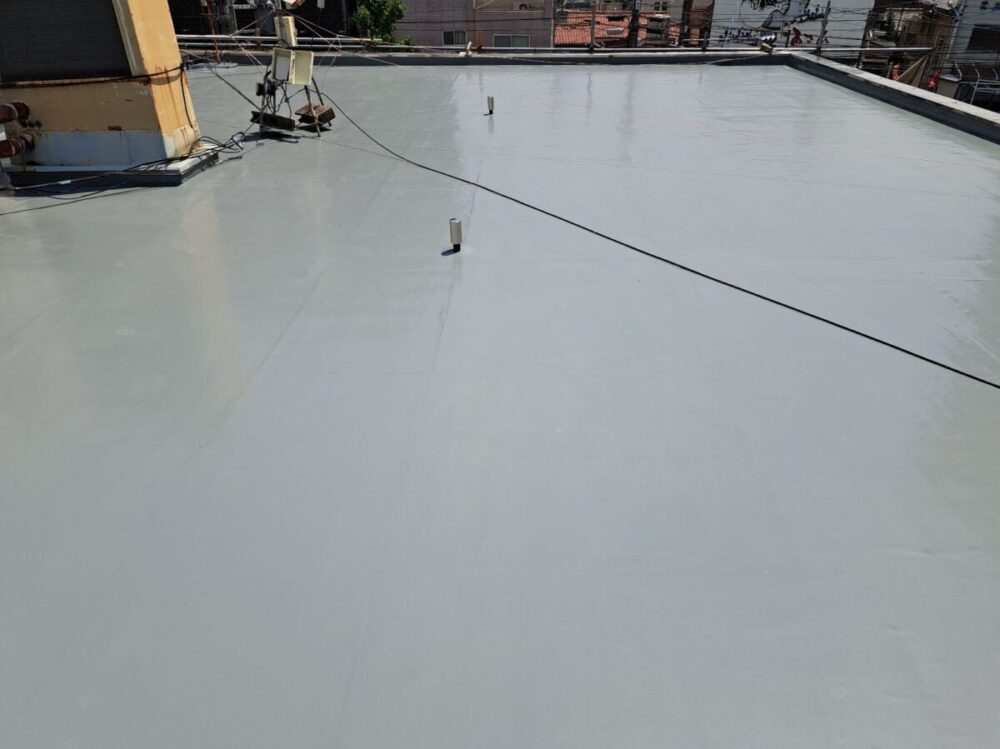 【上塗り】塗料を塗り重ね、色ムラを無くし美しく仕上げます。屋上防水工事①