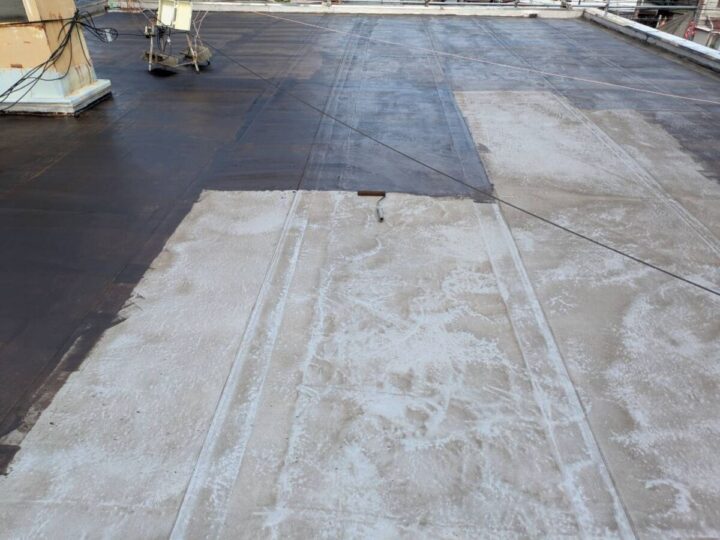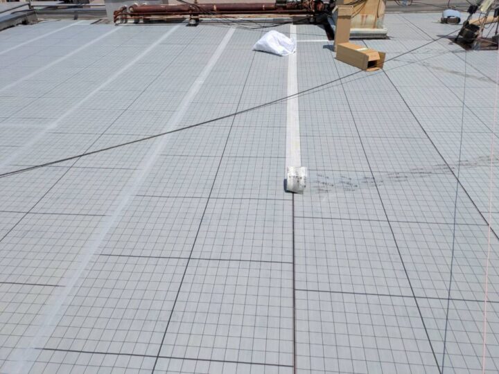 【通気緩衝シート貼り】シートを張り付け通気層をつくり、新規防水層のふくれなどの不具合を防止します。屋上防水工事③