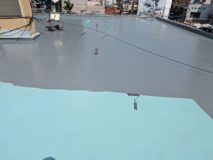 【ウレタン塗膜流し込み2回目】一層目同様に塗布し厚みをつけていきます。屋上防水工事⑥