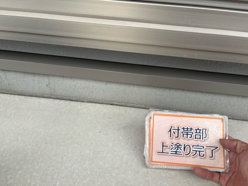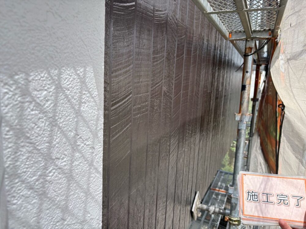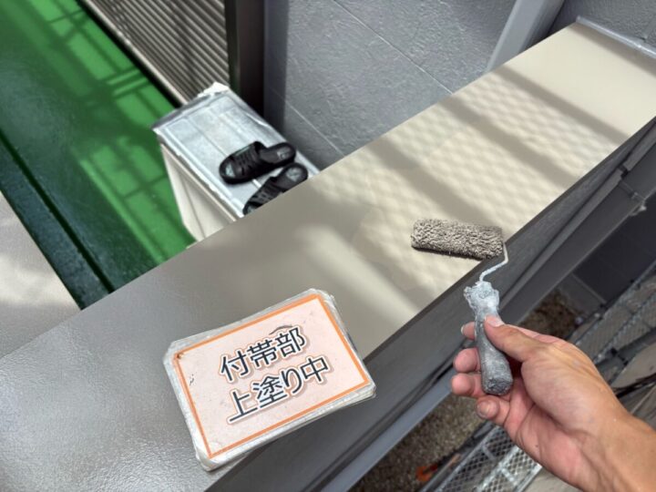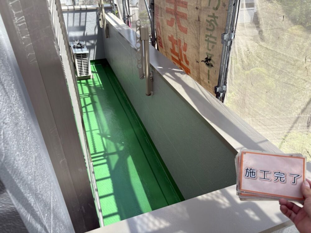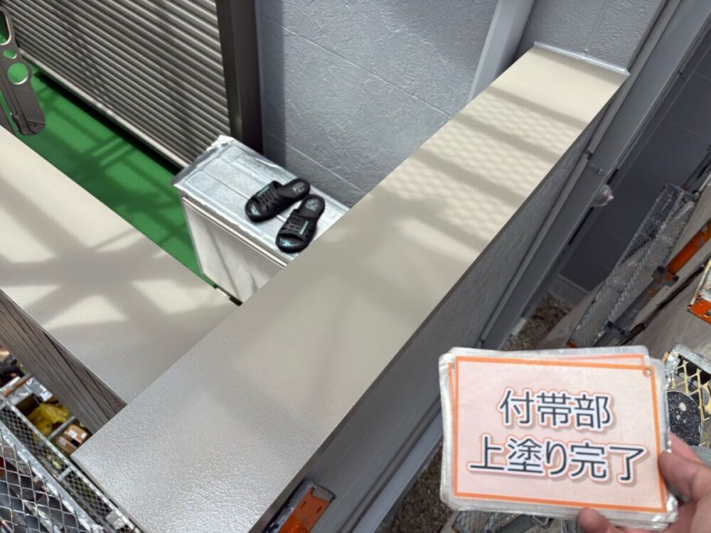 【上塗り】塗料を3回塗り重ねることで外壁の艶が増し、紫外線や雨水に強い耐久性のある外壁に仕上がります。ベランダ笠木塗装①