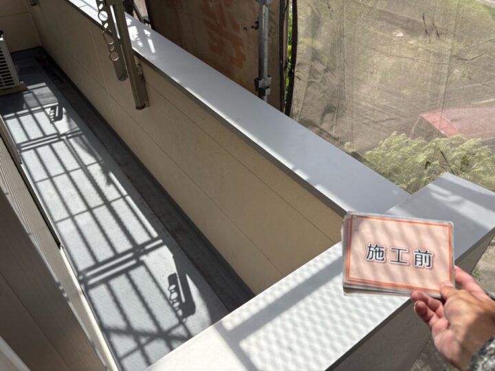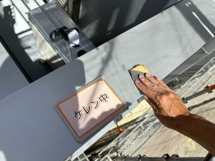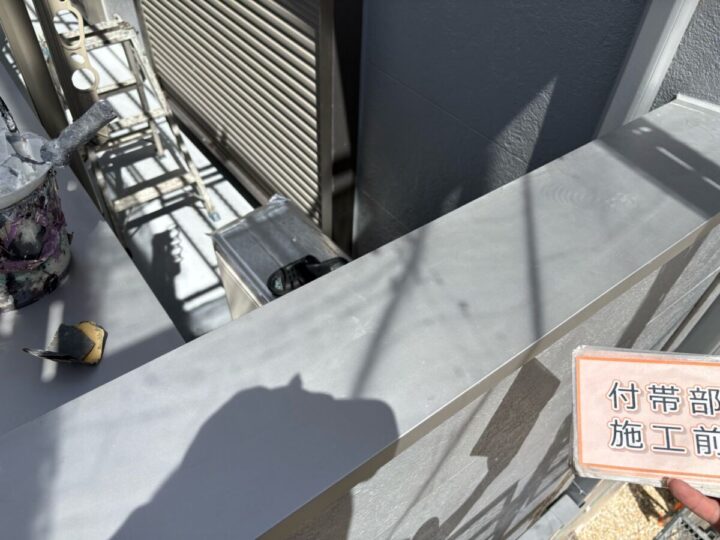 【ケレン】錆や汚れをきれいに落とし、平面を平滑に仕上げ塗料の密着率を上げる作業をします。ベランダ笠木塗装②