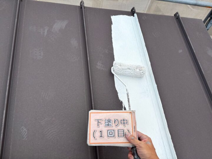 【下塗り】上塗り塗料の密着性を高め、断熱性能を高める効果があります。屋根塗装②
