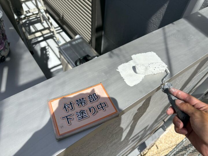 【下塗り】錆び止め塗料を塗布し、鉄部の錆び防止をします。ベランダ笠木塗装③