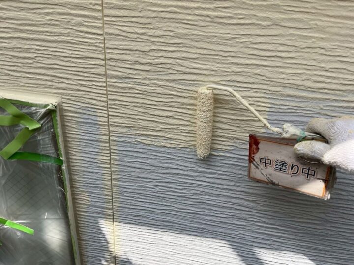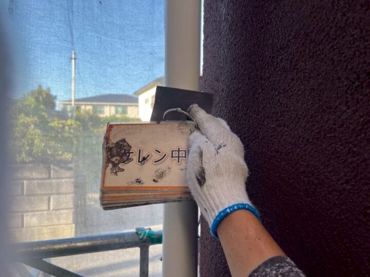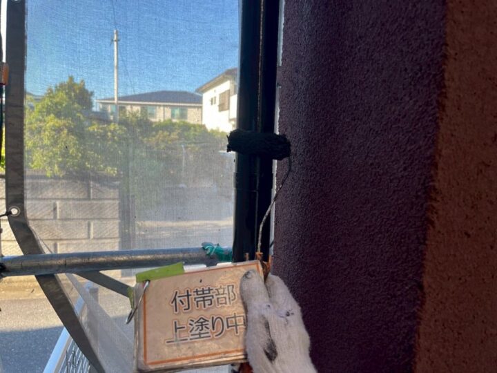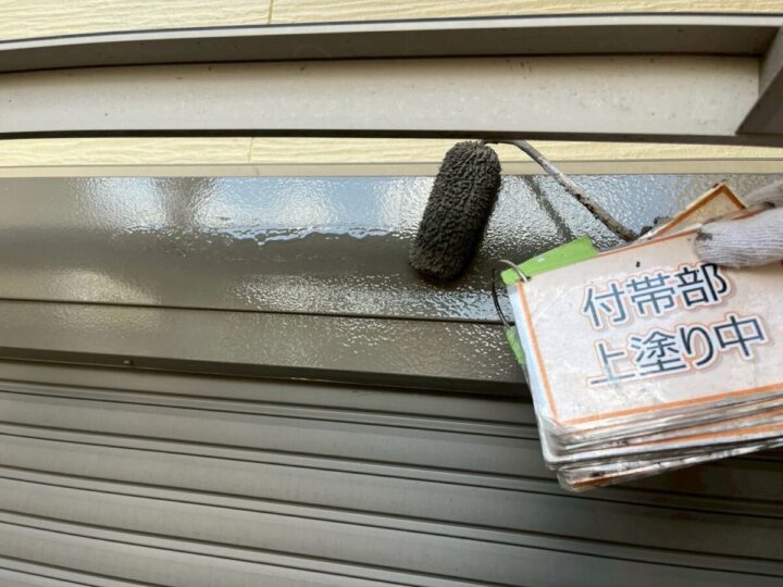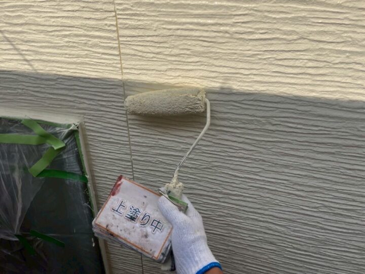 【上塗り】塗料を3回塗り重ねることで外壁の艶が増し、紫外線や雨水に強い耐久性のある外壁に仕上がります。