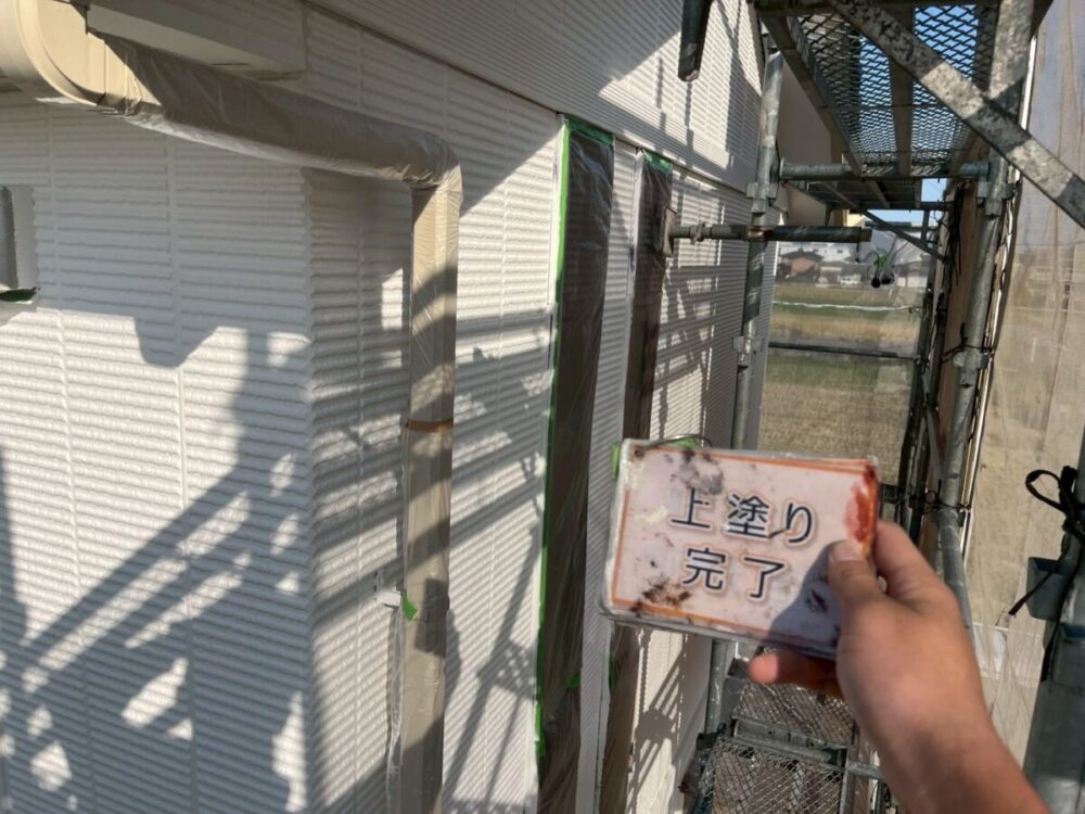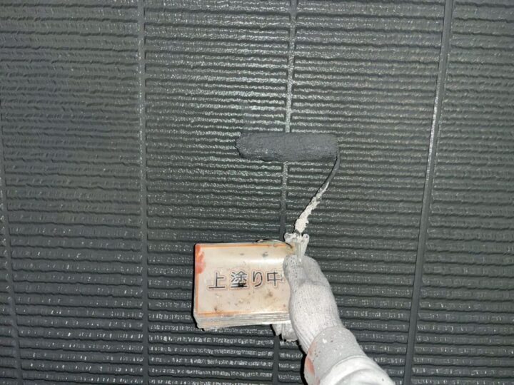 【上塗り】塗料を3回塗り重ねることで外壁の艶が増し、紫外線や雨水に強い耐久性のある外壁に仕上がります。