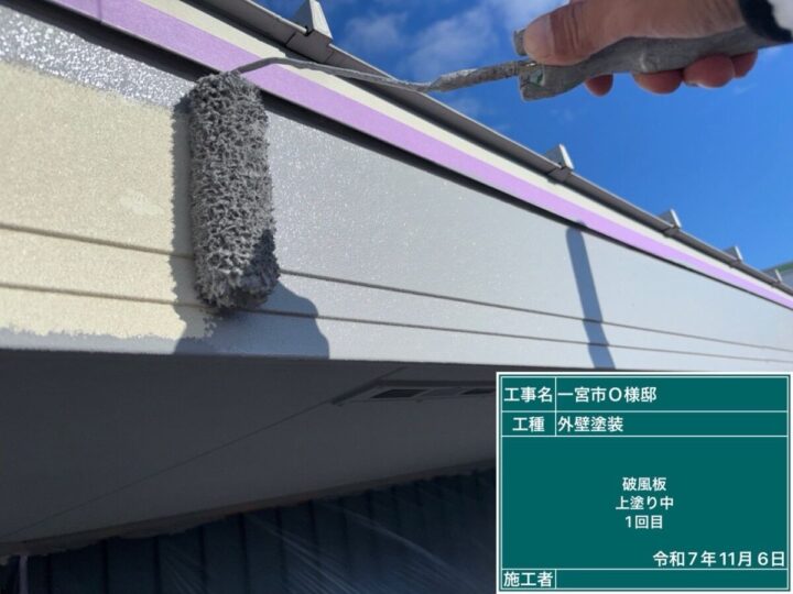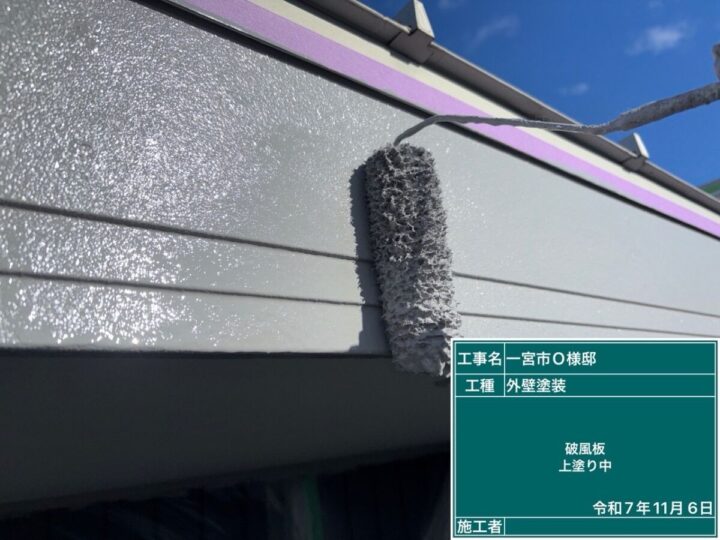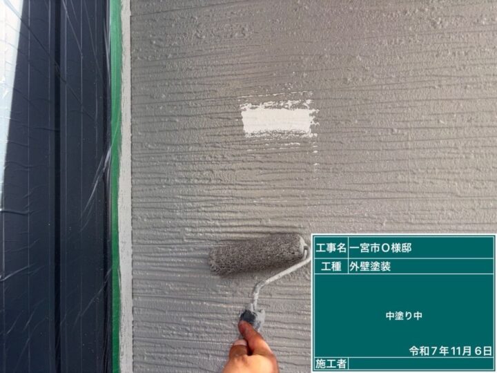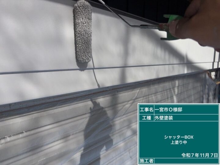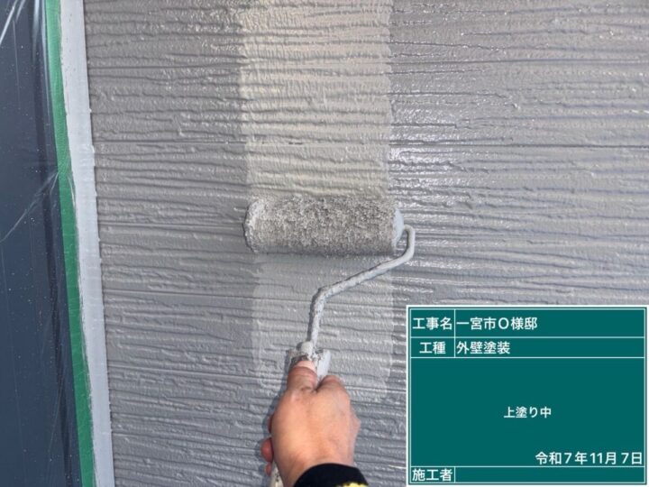 【上塗り】塗料を3回塗り重ねることで外壁の艶が増し、紫外線や雨水に強い耐久性のある外壁に仕上がります。