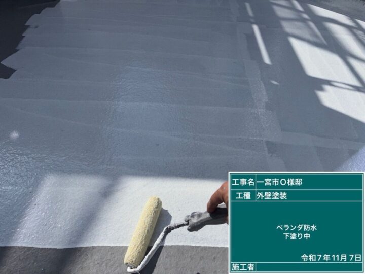 【プライマー塗布】既存防水層と新規防水層をがっちりと接着させる役割があります。