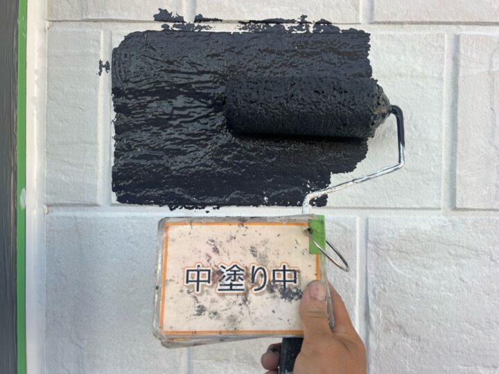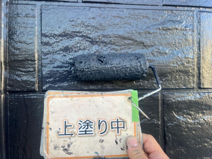 【上塗り】塗料を3回塗り重ねることで外壁の艶が増し、紫外線や雨水に強い耐久性のある外壁に仕上がります。