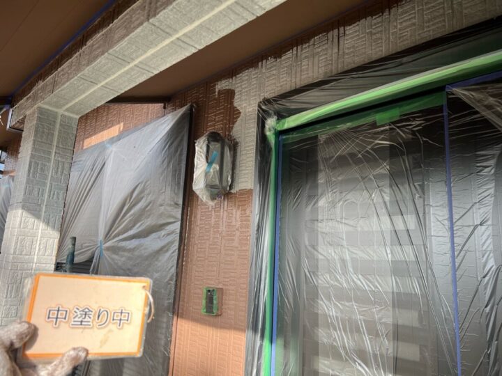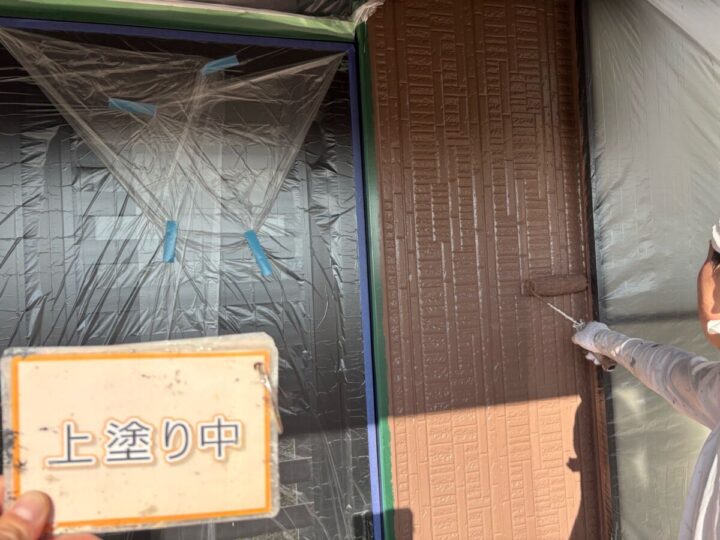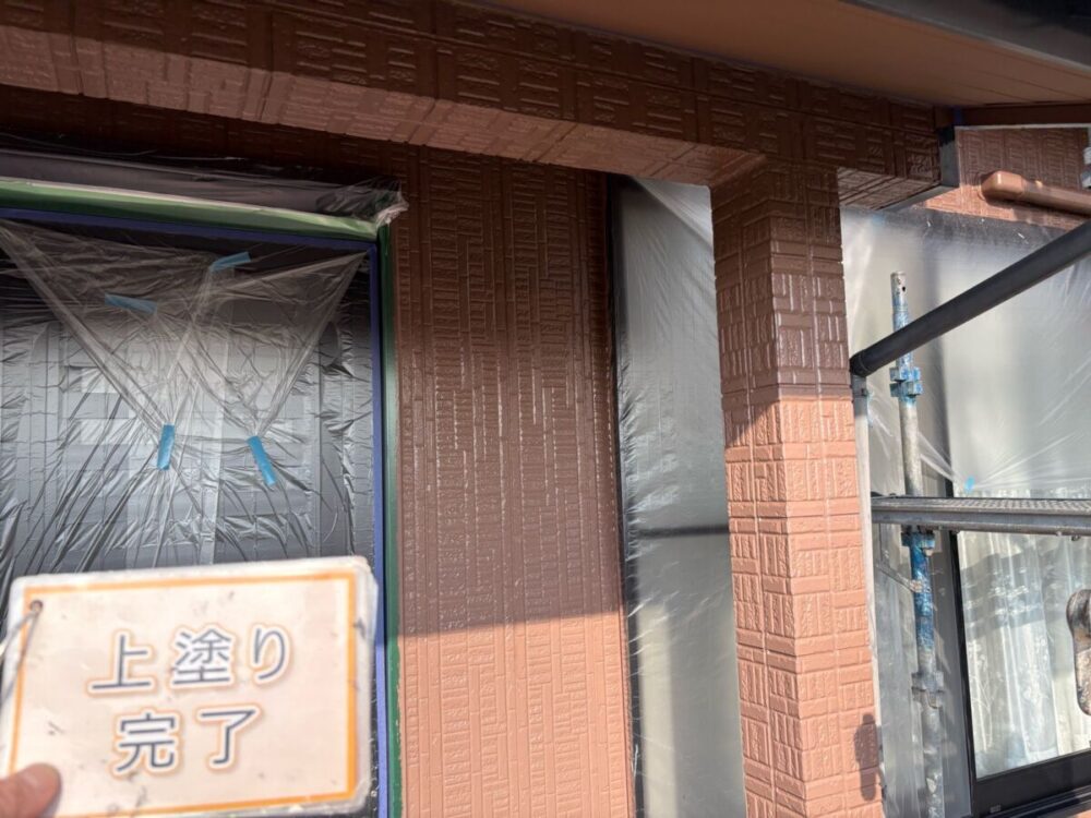 【上塗り】塗料を3回塗り重ねることで外壁の艶が増し、紫外線や雨水に強い耐久性のある外壁に仕上がります。