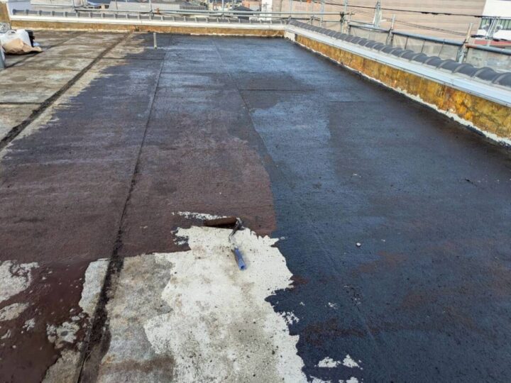 【プライマー塗布】既存防水層と新規防水層をがっちりと接着させる役割があります。