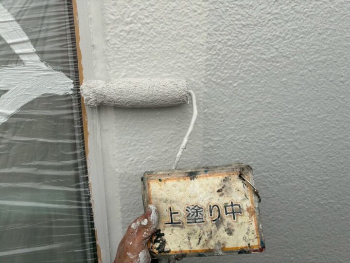 【上塗り】塗料を3回塗り重ねることで外壁の艶が増し、紫外線や雨水に強い耐久性のある外壁に仕上がります。