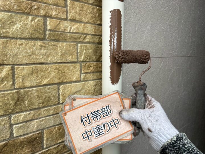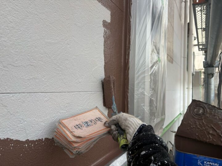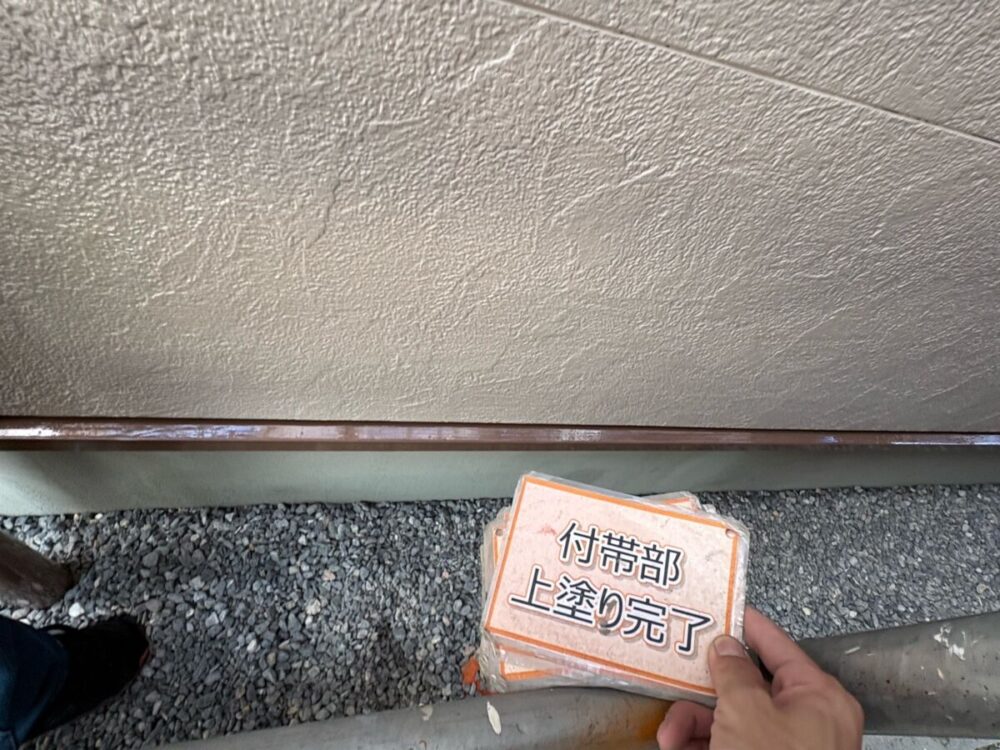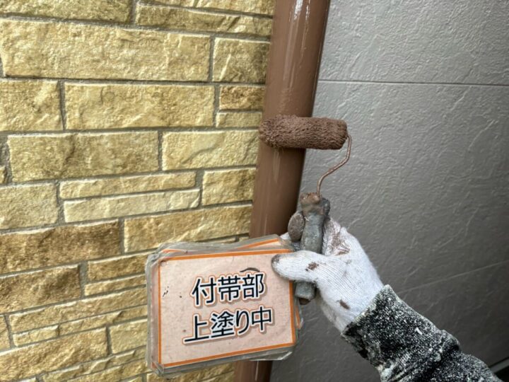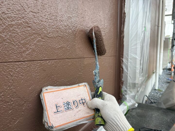 【上塗り】塗料を3回塗り重ねることで外壁の艶が増し、紫外線や雨水に強い耐久性のある外壁に仕上がります。