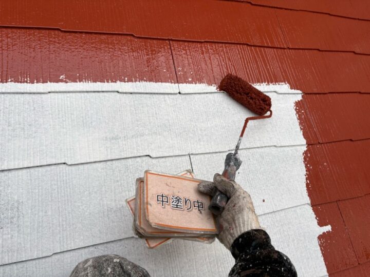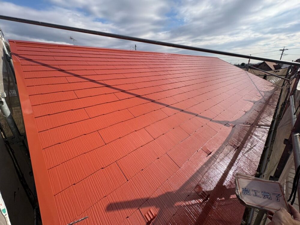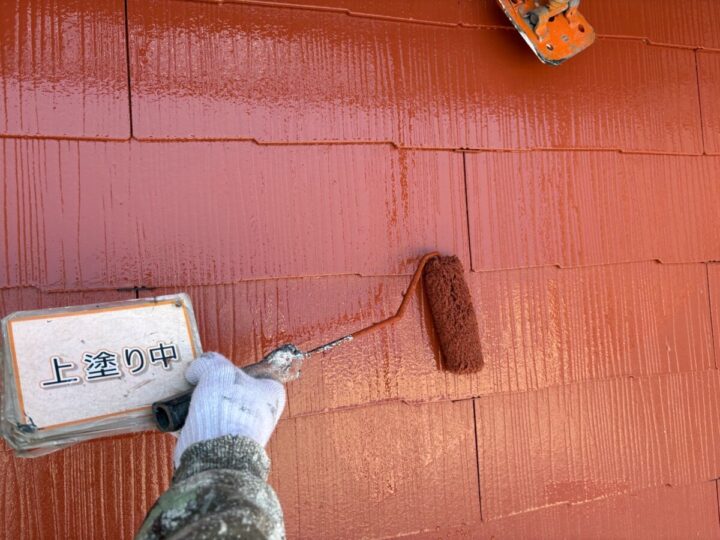 【上塗り】塗料を3回塗り重ねることで艶が増し、紫外線や雨水に強い耐久性のある屋根に仕上がります。